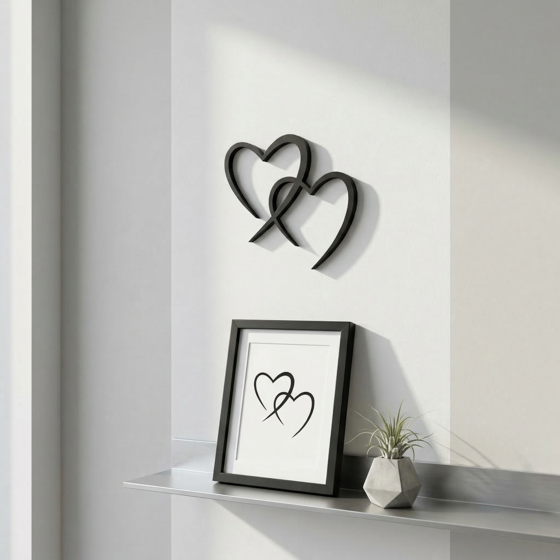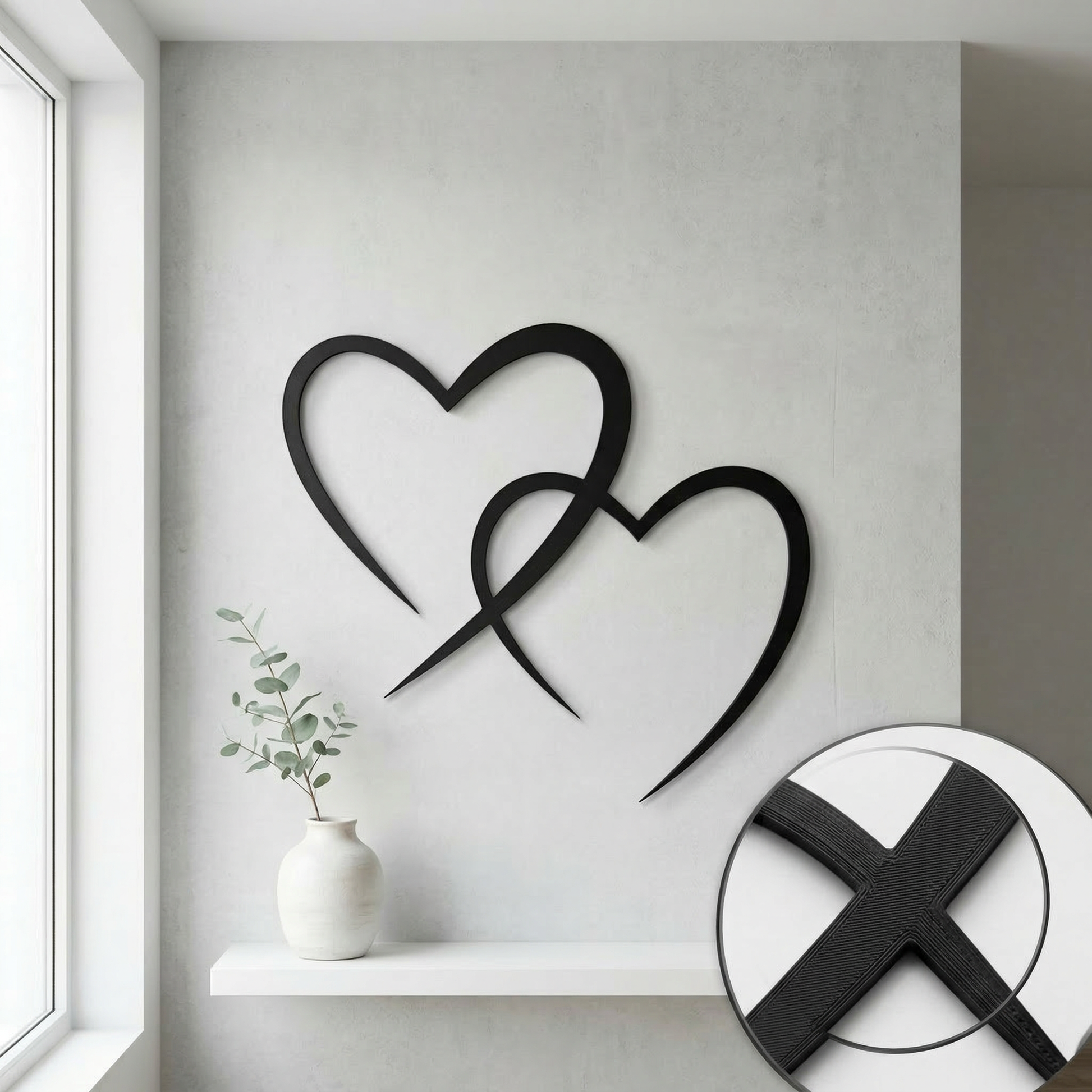 Mit dieser 3D‑gedruckten Wanddeko holst Du genau dieses Gefühl in Dein Zuhause: Zwei Herzen, die sich elegant überschneiden – wie ein stilles Versprechen, zusammenzugehören.
